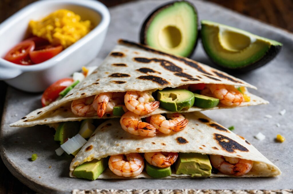 Quesadilla tostada de Camarones, palta y choclo