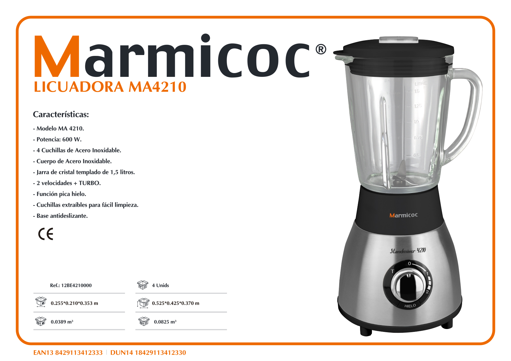 2 velocidades + TURBO Permite exprimir los alimentos a gran velocidad y utilizar la función turbo para optimizar el resultado final. Vaso de gran capacidad La licuadora Stabmixer MA 4200 de Marmicoc incorpora una jarra de cristal templado de 1,5 litros, ideal para preparar batidos para toda la familia . |