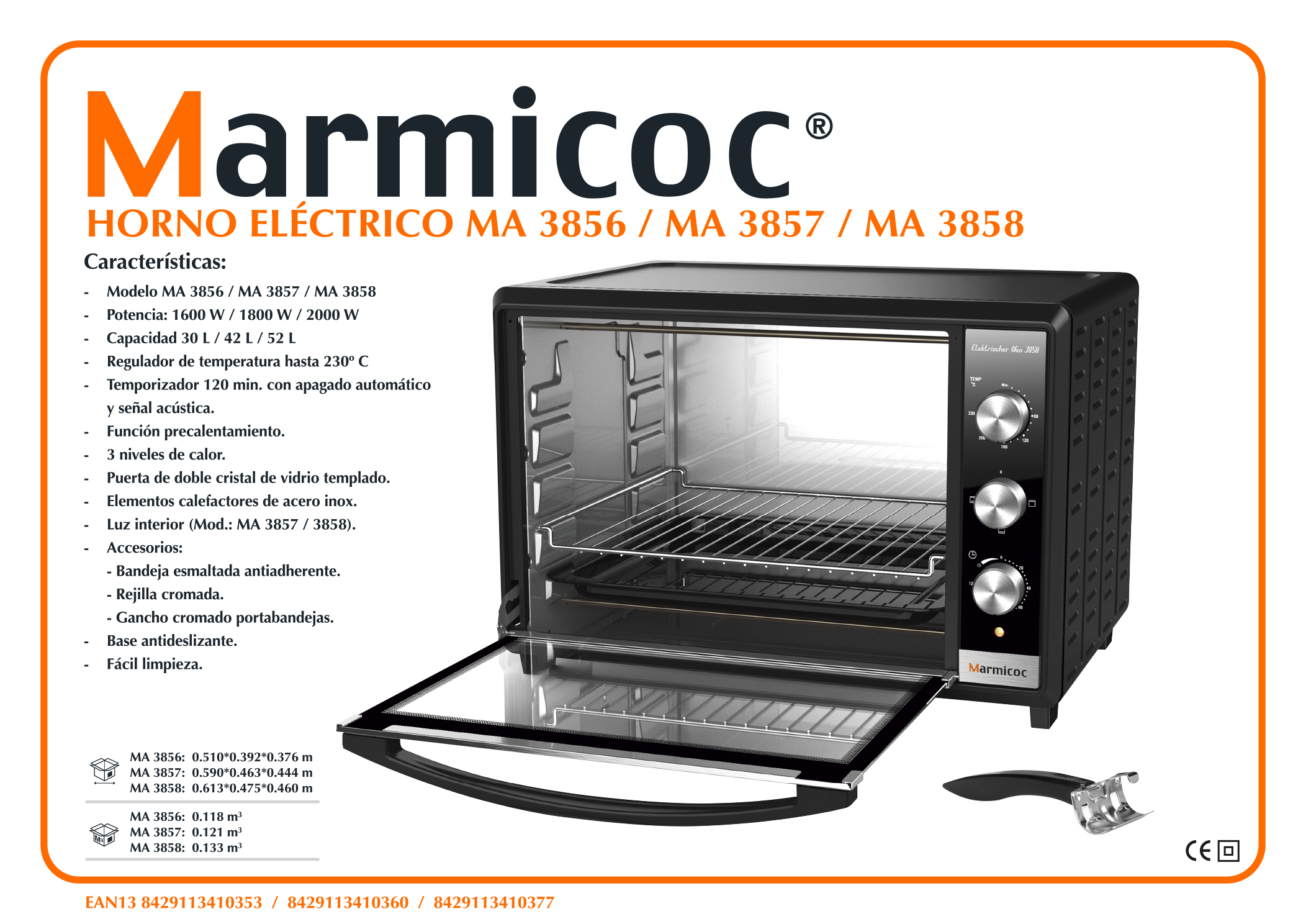 | Seguridad en la cocina La seguridad es lo primero y el horno Elektrischer Ofen MA 3858 de Marmicoc no se queda atrás en esto. Su puerta con doble cristal evita quemaduras y mantiene el calor interior y su base anti deslizante lo fija a la superficie de trabajo evitando que se mueva en la superficie de apoyo. Incorpora un temporizador para que tus recetas no se pasen ni un minuto.Fácil limpieza Sus bandejas esmaltadas antiadherentes, se limpian cómodamente y pueden intercambiarse para ahorrar tiempo en la cocina. |