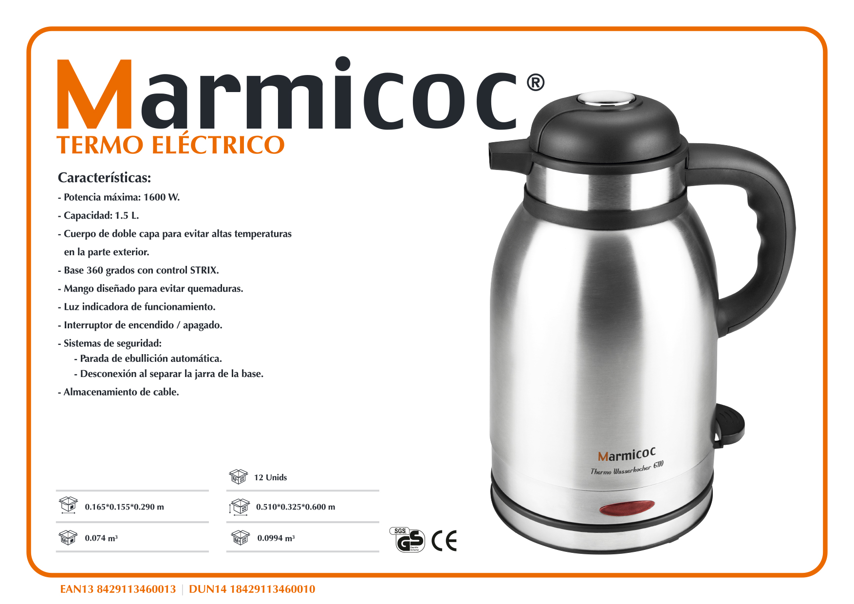 El termo eléctrico Wasserkocher MA 6710 de Marmicoc permite preparar cafés, infusiones o agua caliente de manera rápida. Con una capacidad de 1,5 L, es ideal para preparar bebidas calientes para toda la familia o añadir agua durante la cocción de arroz o pasta.