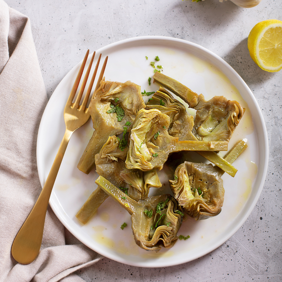Lavamos las alcachofas y eliminamos la parte central y las hojas exteriores. Cortamos el resto a la mitad y salpimentamos. En una Sartén Antártida, calentamos un chorrito de aceite, mientras pelamos los ajos y los picamos finitos. Una vez calienta el aceite, añadimos los ajos y los rehogamos despacio. Pasados un par de minutos, añadimos las alcachofas y las doramos unos minutos. Ponemos el vino blanco y tapamos para que las alcachofas se cocinen en el vino durante media hora. Pasado este tiempo, retiramos las alcachofas y servimos acompañadas de guarnición de puré de patatas o cuscús.