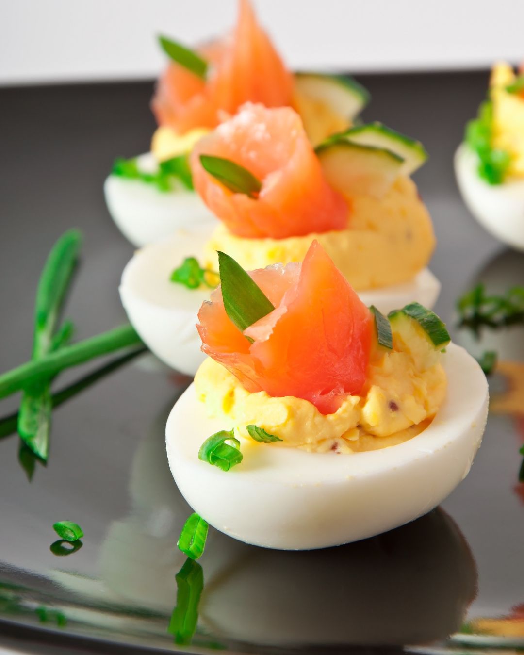 Cuando cocemos marisco como camarones, gambas o langostinos, conseguiremos que su textura sea más tersa y se pelen facilmente si recién cocidos los sumergimos unos minutos en agua helada. Podemos sustituir el salmón fresco por salmón ahumado o marinado. Para facilitar la tarea de rellenar las claras se puede utilizar una manga pastelera.