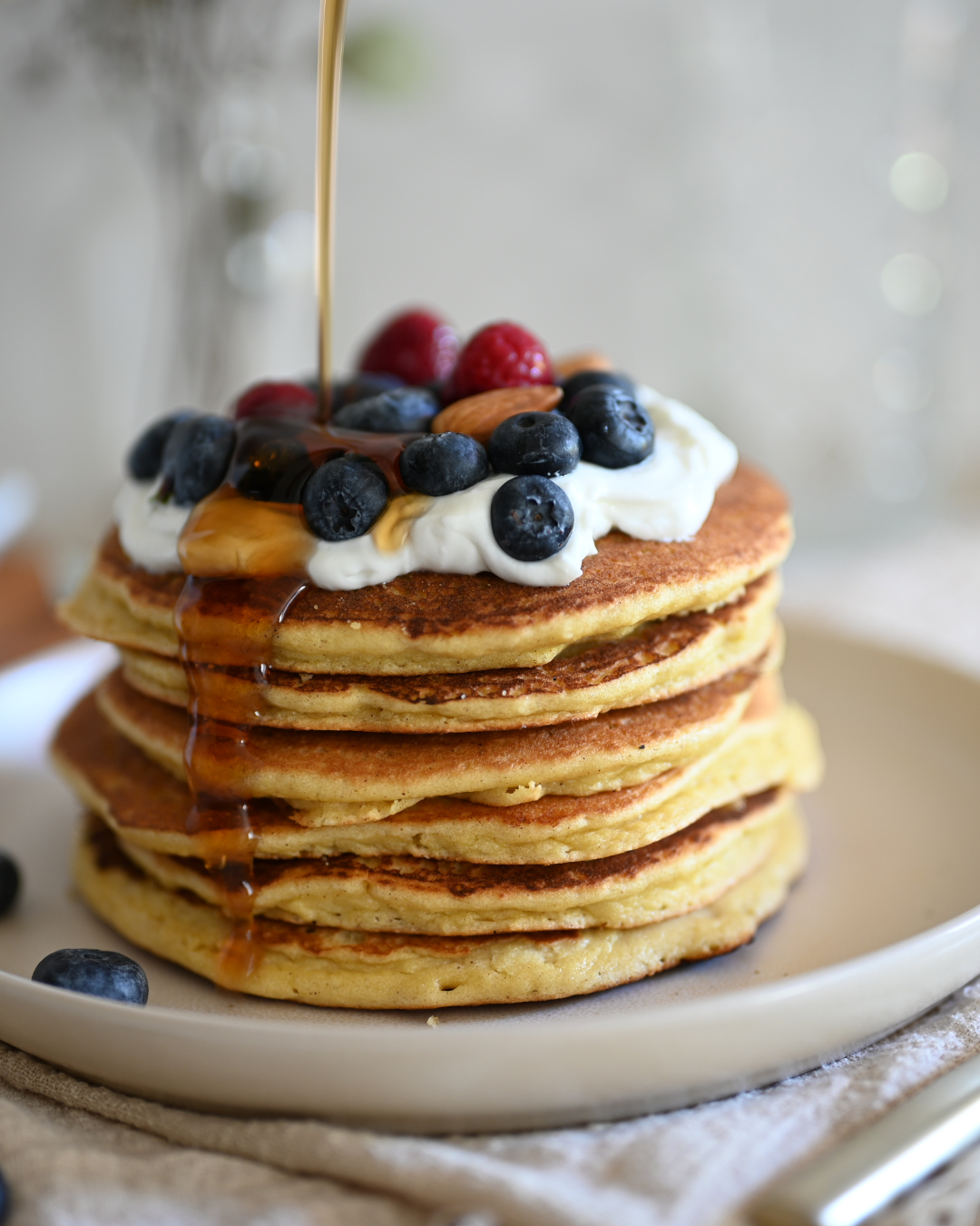 Separamos las yemas de las claras y las ponemos en un bol, junto con una cucharada de azúcar y la leche. Batimos todos los ingredientes y añadimos la harina. Mezclamos hasta obtener una mezcla uniforme. En un bol aparte, mezclamos las claras con el resto del azúcar y batimos hasta formar un merengue bien espumoso. Añadimos el merengue a la mezcla con la harina con movimientos envolventes para mantener la espuma del merengue. En la sartén Champagne muy caliente, añadimos un par de cucharadas de la mezcla y dejamos cocinar un par de minutos hasta que esté dorada. Le damos la vuelta y cocinamos otro par de minutos por el otro lado. Servimos acompañado por mermelada, frutos rojos, miel o acompañamiento al gusto.